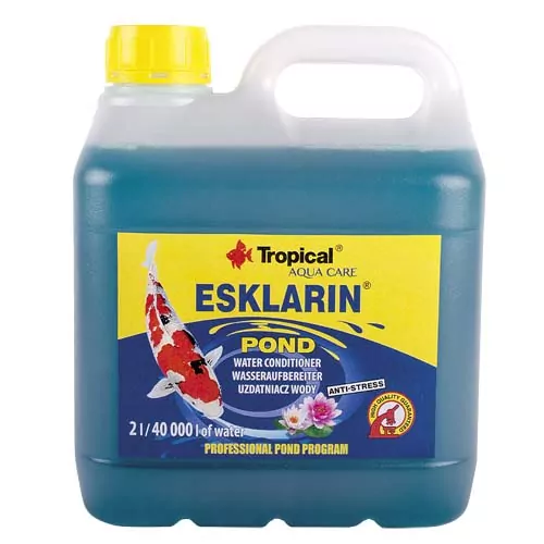 ESKLARIN POND - KONDICIONÉR VODY - PÔSOBÍ ANTISTRESOVO - 2 l / 40 000 l vody. Prípravok slúži na do úpravu surovej vodovodnej vody určenej pre naplňovanie záhradných jazierok. Odporúčaný špeciálne pri zakladaní nového záhradného jazierka, počas periodických výmen vody v malých jazierkach, počas karanténe a rekonvalescencii rýb v akváriách alebo iných nádržiach. ESKLARIN POND neutralizuje jedovaté soli ťažkých kovov, chráni žiabre, pokožku a plutvy rýb pred agresívnym pôsobením čerstvej vodovodnej vody, urýchľuje regeneráciu poškodenej počas prepravy a lovenia rýb pokožky, pôsobí antistresovo, čím uľahčuje prevážanie a aklimatizáciu rýb.