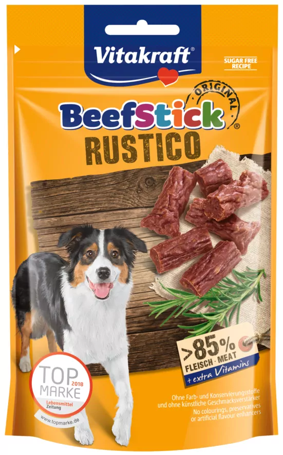 Doplnkové krmivo pre psov. Beef Stick® Rustico 55 g je vyrobená s veľkou láskou podľa osvedčenej originálnej receptúry Beef Stick®.
