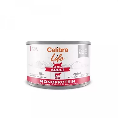 Calibra Cat Life Adult Beef - konzerva s hovädzím, ktorá je určená pre dospelé mačky. Kompletné vlhké krmivo je založené na jedinom druhu proteínu a zostavené z limitovaného počtu ingrediencií. Zloženie konzervy je bezobilninové a bezlepkové, čo má vplyv na ľahkú stráviteľnosť. Obsahuje len 100 % špecifikované suroviny tej najvyššej kvality.