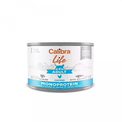 Calibra Cat Life Adult Chicken – konzerva s kuracím, ktorá je určená pre dospelé mačky. Kompletné vlhké krmivo je založené na jedinom druhu proteínu a zostavené z limitovaného počtu ingrediencií. Zloženie konzervy je bezobilninové a bezlepkové, čo má vplyv na ľahkú stráviteľnosť. Obsahuje len 100 % špecifikované suroviny tej najvyššej kvality.