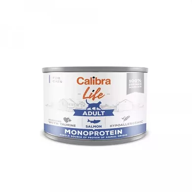 Calibra Cat Life Adult Salmon – konzerva s lososom, ktorá je určená pre dospelé mačky. Kompletné vlhké krmivo je založené na jedinom druhu proteínu. Ide o hypoalergénnu receptúru zostavenú z limitovaného počtu ingrediencií. Konzerva je bez obilnín a lepku, čo má pozitívny vplyv na výbornú stráviteľnosť. Obsahuje len 100 % špecifikované suroviny tej najvyššej kvality.