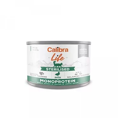 Calibra Cat Life Sterilised Duck – konzerva s kačacím, ktorá je určená pre dospelé mačky, vhodná pre sterilizované/kastrované mačky. Kompletné vlhké krmivo je energeticky vyvážené. Receptúra je monoproteínová a zostavená z limitovaného počtu ingrediencií. Zloženie bez obilnín a lepku má vplyv na ľahkú stráviteľnosť. Krmivo obsahuje len 100 % špecifikované suroviny tej najvyššej kvality.