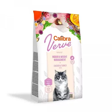 Calibra Cat Verve Indoor + Weight Management Chicken & Turkey je kompletné krmivo s kuraťom a morkou, bez obilnín, s vysokým obsahom čerstvého mäsa. Receptúra je určená pre mačky žijúce v domácnosti a tiež pre jedince, ktoré potrebujú postrážiť líniu. Čerstvé mäso z kurčaťa v tejto receptúre tvorí 27 % celkového obsahu. Proteíny živočíšneho pôvodu dosahujú 80,8 %.