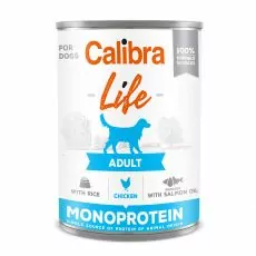 Calibra Dog Life Adult Chicken with Rice – konzerva s kuraťom, kuracími srdiečkami a ryžou je kompletným krmivom, ktoré je určené pre dospelé psy. Receptúra je založená na jedinom druhu proteínu a zostavená z limitovaného počtu ingrediencií. Zloženie konzervy je bezlepkové, s nízkym obsahom ryže, čo má vplyv na ľahkú stráviteľnosť. Obsahuje len 100 % špecifikované suroviny tej najvyššej kvality.