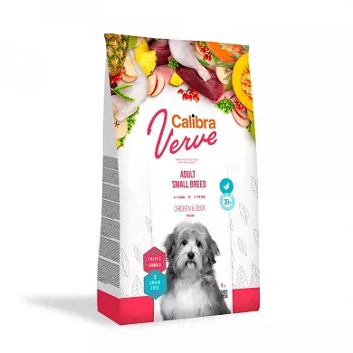 Calibra Dog Verve Adult Small Breed (Chicken & Duck) je kompletným suchým krmivom s čerstvým mäsom a bez obilnín. Táto receptúra je určená pre dospelé psy malých plemien s hmotnosťou 1-10 kg. Vysoký obsah čerstvého kuracieho mäsa 30 % a kvalitný kačací proteín v tejto receptúre poskytnú psovi výživu, ktorá je v súlade s jeho prirodzenými stravovacími inštinktmi a fyziologickými potrebami.