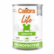Calibra Dog Life Sensitive Rabbit - konzerva s králikom je kompletným krmivom pre dospelé psy - a to i pre psov s citlivým trávením. Hypoalergénna receptúra je založená na jednom druhu proteínu a zostavená z limitovaného počtu ingrediencií. Zloženie konzervy je bez obilnín a lepku, čo má vplyv na vynikajúcu stráviteľnosť. Obsahuje len 100 % špecifikované suroviny tej najvyššej kvality.