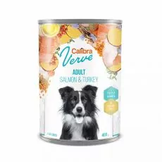 Calibra Dog Verve Adult Salmon & Turkey je kompletné vlhké krmivo bez obilnín určené pre dospelé psy. Receptúru tvorí netradičná kombinácia morčacieho a lososa s mrkvou, batátmi, šípkami, rakytníkom a čakankou.