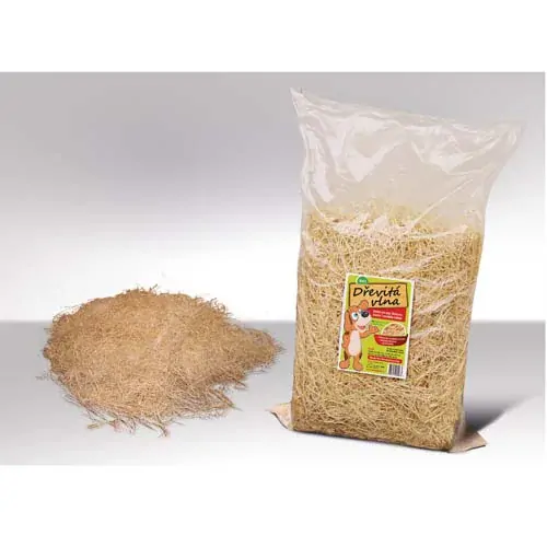 Drevitá vlna - Podstielka pre psov, hlodavce, domáce i exotické zvieratá. 100% prírodný materiál z mäkkého dreva. Pohlcuje vlhkosť a pachy, antibakteriálna, bezprašná. Vo vlne sa netvoria plesne. Bez chemického ošetrenia. Použitie: Načechranou drevitou vlnou vysteľte búdu alebo koterec. Vymeňte podľa potreby. Likvidujte ako bioodpad!