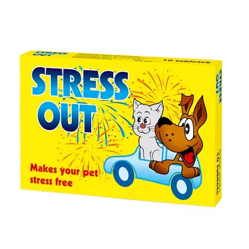 Upokojujúci prípravok pre psy a mačky 10 dávok v balení. STRESS OUT je prírodný upokojujúci prostriedok, ktorý obsahuje tryptofán, Hypericum a taurín. Tryptofán (prekurzor serotonínu) znižuje svalové napätie a zvyšuje odolnosť proti stresu. Hypericum zvyšuje množstvo serotonínu v mozgu a tým vyvoláva pocit radosti. Taurín znižuje nadmerné rozrušenie počas stresu. Stress Out doplnkové krmivo, ktoré nie je návykové a nemá žiadne vedľajšie účinky takže je veľmi bezpečné aj pri dlhodobom podávaní. Stress out je prípravok určený na podávanie psom alebo mačkám v akýchkoľvek stresových situáciách ako napr. ohňostroj, sťahovanie, cestovanie alebo zavedenie do nového domova. Jedna dávka obsahuje: Hypericum perforatum 57,2 mg, Zingiber officinale 49,4 mg, tryptofán 32,5 mg, Taurín 24,7 mg. Doplnkové látky: technologické doplnky, senzorické doplnky. Analytické zložky: N-látky 28,4%, sacharidy 24,2%, popol 21,7%, vápnik 4,5%, fosfor 3,7%, vláknina 2,7%, oleje a tuky 2%. Dávkovanie: odporúčaná je jedna dávka na 8 kg telesnej hmotnosti zvieraťa za deň. V prípade potreby môže byť zvýšená na 3 dávky na 8 kg telesnej hmotnosti za deň. Na dosiahnutie plného účinku sa odporúča začať prípravok podávať 3-4 dní pred stresujúcou situáciou a pokračovať v podávaní počas jej trvania. V prípade nepredvídaného stresu by mala byť dávka podaná tak rýchlo ako je to len možné. Priaznivé účinky podávania môžu pretrvávať až 3-4 dní po podaní poslednej dávky.