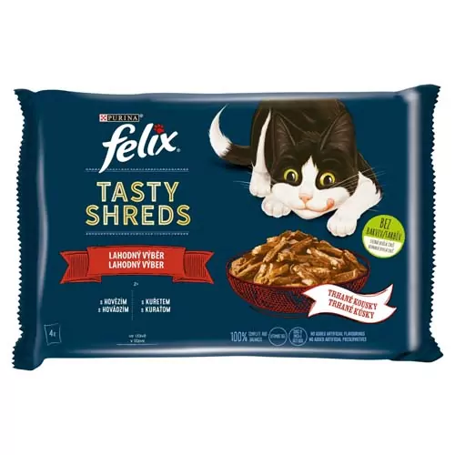 Potešte maškrtný jazýček svojej mačky kapsičkami Felix Tasty Shreds lahodný výber. Kapsičky s trhanými kúskami mäsa v lahodnej šťave nielenže dobre chutia, ale dodajú vášmu maznáčikovi potrebné vitamíny a esenciálne omega-6 mastné kyseliny.