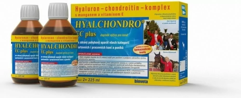 Hyalchondro EC plus 2x225ml - Unikátny výživový doplnok určený na podporu vývoja a udržania zdravého pohybového aparátu všetkých kategórií športových a pracovných koní a pony. Prípravok obsahuje najvyššiu koncentráciu kyseliny hyalurónovej a chondroitín sulfátu v dennej dávke za najvýhodnejšiu cenu na trhu.