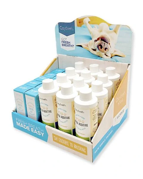 Hľadáte pre svojich zákazníkov alebo pre vlastnú chovateľskú stanicu to najlepšie v oblasti dentálnej hygieny? iM3 Oxyfresh Display Pack je praktické a ekonomické riešenie. Tento štýlový predajný stojan obsahuje 10 kompletných sád (gél + kefka), ktoré sú svetovou jednotkou v boji proti zápachu z papule a zubnému kameňu u domácich zvierat.