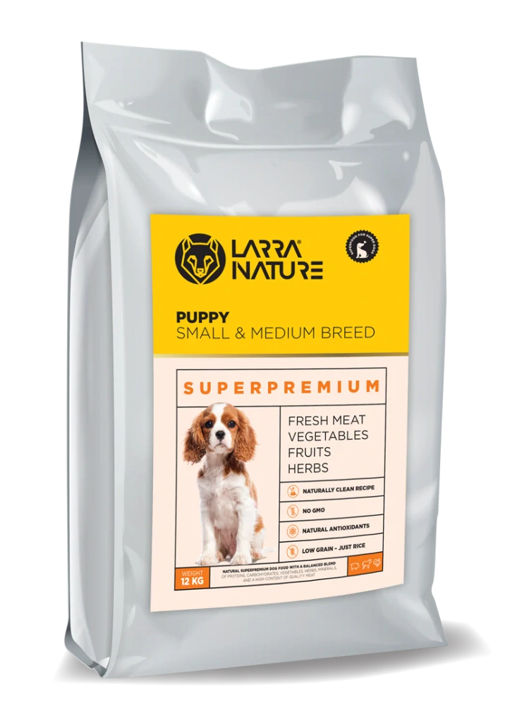 Larra Nature Puppy – Small Breed: je prírodné prémiové krmivo pre šteňatá všetkých malých a stredných plemien s vyváženým pomerom bielkovín, sacharidov, s obsahom zeleniny, bylín , minerálnych látok a veľkou porciou mäsa. Tanín, Ostropestrec mariánsky, Kolagén a Huminové látky podporujú dobrú funkciu tráviaceho traktu, imunitného a pohybového systému a detoxikujú organizmus. Krmivo neobsahuje žiadne chemické ochucovadlá ani konzervanty. Granula má priemer 6mm.