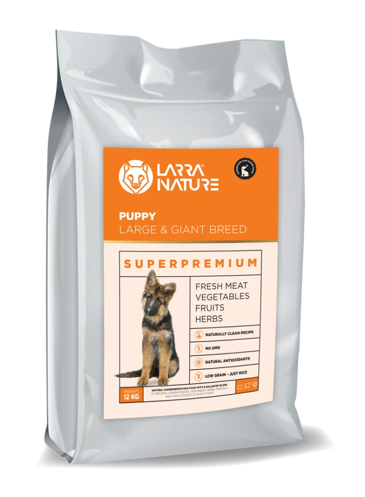 Larra Nature Puppy Large Breed: je prírodné prémiové krmivo pre šteňatá veľkých a obrích plemien so zvýšeným obsahom bovinného kolagénu s vyváženým pomerom bielkovín, sacharidov, obsahom zeleniny, bylín, minerálnych látok a veľkou porciou mäsa. Tanín, Ostropestrec mariánsky, Kolagén a Huminové látky podporujú dobrú funkciu tráviaceho traktu, imunitného a pohybového systému a detoxikujú organizmus. Krmivo neobsahuje žiadne chemické ochucovadlá ani konzervanty. Všetky suroviny obsiahnuté v krmive sú výhradne od slovenských dodáveteľov. Granula má priemer 10mm