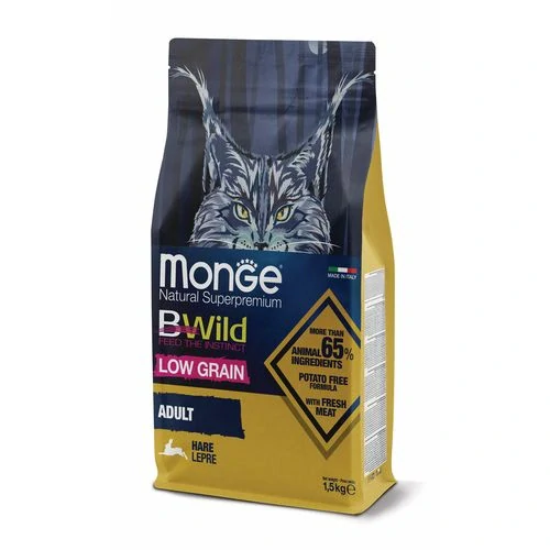 MONGE BWild Cat Low Grain Adult 1,5 kg kompletné krmivo pre dospelé mačky s králikom a so znížením obsahom obilnín