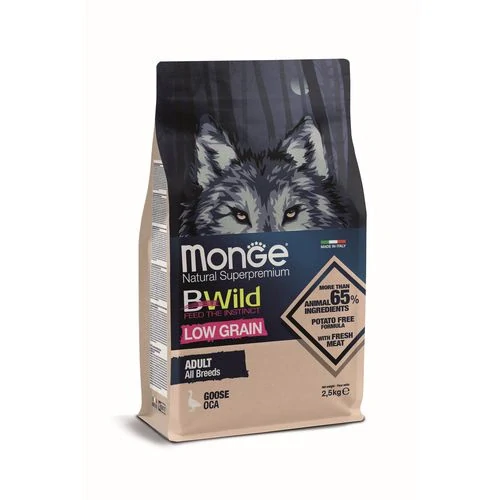 MONGE BWild Low Grain Adult 2,5 kg kompletné krmivo pre dospelých psov s husacím mäsom a so znížením množstvom obilnín