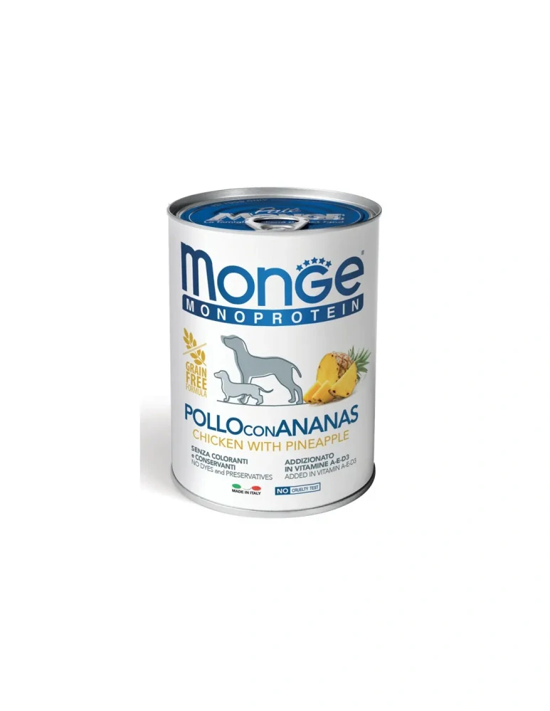 Monge MONOPROTEICO je chutná paštéta pre psov z radu jednoproteínových krmív z vybraného kuracieho mäsa najvyššej kvality s prídavkom tapioky a ananásu.