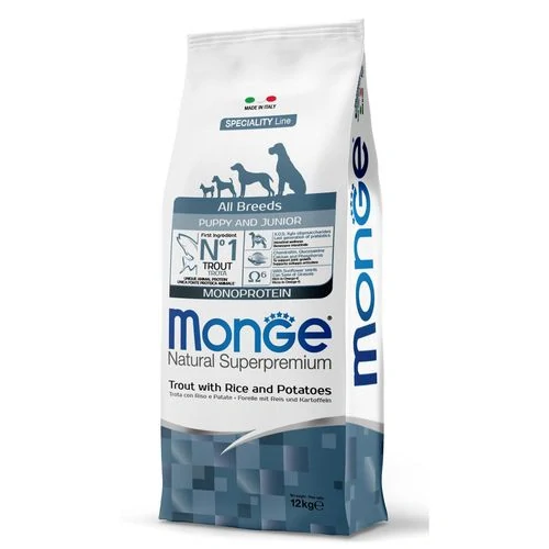 Monge Natural Superpremium All Breeds Puppy and Junior Monoprotein Trout s ryžou a zemiakmiMonge Natural Superpremium All Breeds Puppy and Junior Monoprotein* Trout s ryžou a zemiakmi je kompletné krmivo pre šteniatka všetkých plemien. Je špeciálne vyvinuté s ohľadom na blaho vášho psa vďaka vysoko kvalitným živinám, ktoré sú výsledkom výskumu „Made in Italy“. Produkt je formulovaný s jedným zdrojom živočíšnych bielkovín* – pstruhom ako prvou zložkou – a pridaním čerstvých rýb pre optimálnu stráviteľnosť a chutnosť. Receptúra je obohatená o prebiotiká novej generácie xylo-oligosacharidy (XOS) a celú hnedú ryžu na podporu zdravia čriev, plus superpotraviny, ako sú slnečnicové semienka, prirodzene bohaté na omega-6 a vitamín E. Receptúra tiež obsahuje glukozamín a chondroitín sulfát na podporu vývoja kĺbov a vyvážený pomer vápnika a fosforu pre správny rast kostí a kĺbov šteniat. Bez pridaných umelých farbív a konzervačných látok.