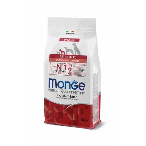 Monge Natural Superpremium Mini Puppy and Junior Rich in Chicken je kompletné krmivo pre šteniatka mini plemien (<10 kg). Špeciálne vyvinuté pre pohodu vášho psa, vďaka prítomnosti špičkových živín, ktoré sú výsledkom výskumu "Made in Italy". Prvou zložkou je kuracie mäso a receptúra sa vyznačuje svojou stráviteľnosťou a chutnosťou vďaka obsahu čerstvého mäsa. Receptúra je obohatená o XOS (xylo-oligosacharidy) novej generácie, ktoré sú prebiotikami na podporu črevného zdravia. Zloženie tiež obsahuje glukozamín a chondroitín sulfát na podporu vývoja kĺbov a vyvážený pomer vápnika a fosforu pre pravidelný rast kostí a kĺbov šteniatka. Bez pridaných farbív a umelých konzervačných látok.