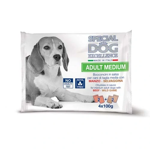 MONGE SPECIAL DOG EXCELLENCE MEDIUM ADULT hovädzie/zverina multi pack 4x100g kapsička3,14 €/ ks