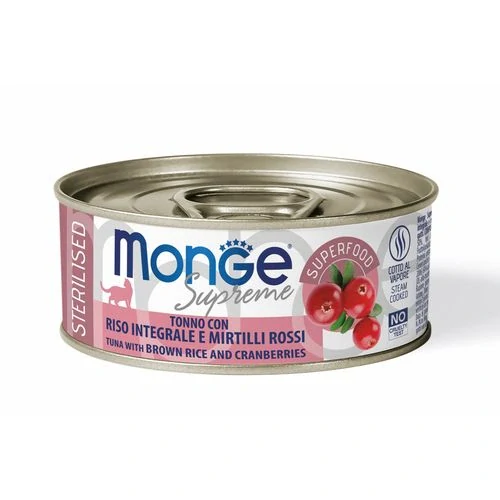 MONGE Supreme Sterilised 80g tuniakové kúsky s hnedou ryžou a brusnicami pre sterilizované mačky