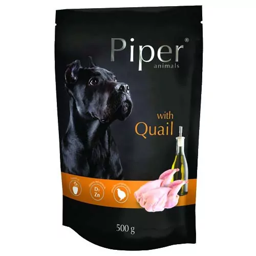Piper Adult - prepelica je kompletné krmivo pre dospelých psov všetkých plemien. Zloženie krmiva bolo zostavené tak, aby sa zabezpečila prítomnosť vysokokvalitných živín, ktoré zaručujú správne fungovanie všetkých metabolických procesov. Prepelica je cenným zdrojom zinku, minerálu, ktorý hrá dôležitú úlohu pri stimulácii obranných funkcií tela. Je tiež zložkou ovplyvňujúcou antioxidačné vlastnosti telových tekutín a hrá dôležitú úlohu pri regulácii funkcie kože.
