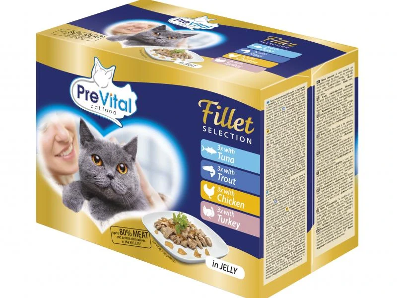 Prevital Fillet Selection kapsička s tuniakom, pstruhom, kuraťom a morkou v želé je kompletné a vyvážené krmivo pre dospelé mačky.