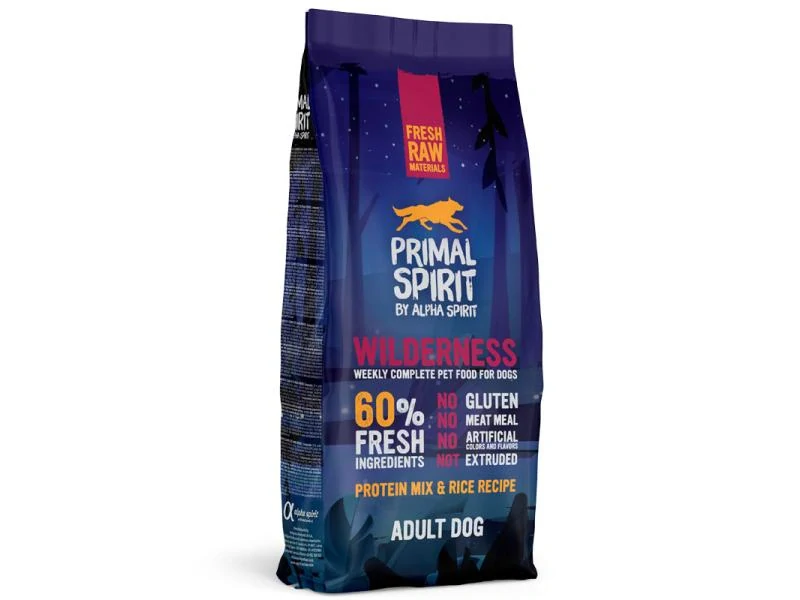 Primal Spirit Dog 60% Wilderness je kompletné suché krmivo pre dospelých psov všetkých plemien, ktoré je vyrobené jedinečnou technológiou lisovania za studena. Tento proces (podobný technológii TENDERIZE™) zaisťuje, že suroviny si zachovajú svoju prirodzenú chuť, vôňu a maximálne množstvo živín, ktoré by sa inak zničili pri klasickom extrudovaní (výrobe granúl pri vysokých teplotách). Výsledkom sú mäkšie, chutné a vysoko stráviteľné granule.