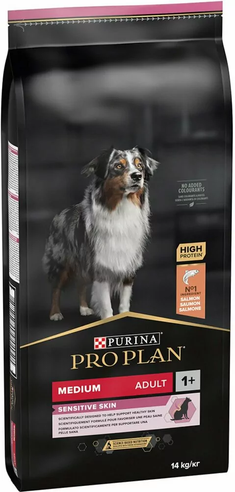 PRO PLAN® Medium Adult Sensitive Skin so zložkou OPTIDERMA je kompletné krmivo pre dospelé psy s citlivou kožou. Krmivo je nutrične vyvážené s ohľadom na ich špecifické výživové potreby a citlivú kožu.