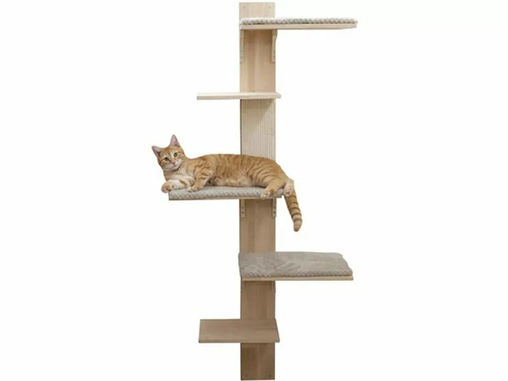 Nástenné škrabadlo pre mačky je vyrobené z masívneho dreva, ležiace plochy sú navyše vybavené béžovými odnímateľnými vankúšikmi. Výška mačacieho stromu je 150 cm a je určený na montáž na stenu, diely na ukotvenie do steny sú súčasťou balenia.