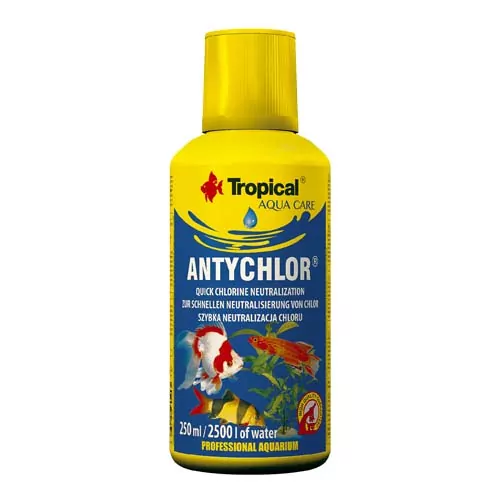 slúži na rýchlu prípravu surovej vodovodnej vody pre akvaristické účely. Odporúčaný pri výmene vody a napúšťaní nového akvária. ANTYCHLOR rýchlo neutralizuje pre akváriové ryby nebezpečný, jedovatý chlór, ktorý je prítomný vo vodovodnej vode, upravovanej pomocou zlúčenín chlóru. Pôsobí okamžite, preto je vhodný pre naliehavé prípady, kedy je nutná rýchla výmena väčšej časti vody v akváriu.