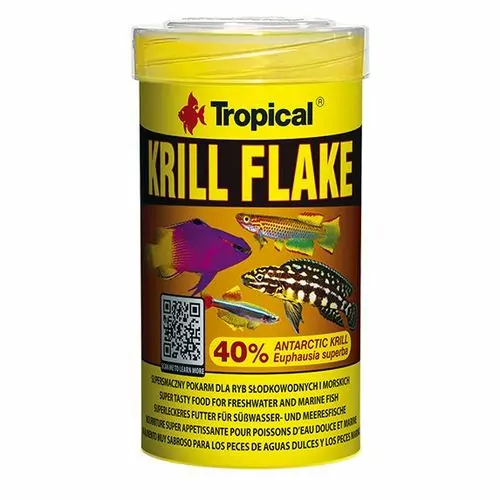 krmivo na vyfarbenie vo forme vločiek s vysokým obsahom pancierovky antarktickej (40%). Určené na každodenné kŕmenie všežravých a mäsožravých rýb v morských a sladkovodných akváriách. Vzhľadom na vynikajúcu chuť je obzvlášť vhodné na kŕmenie rýb, ktoré nepoznajú hotové jedlá (vylovené ryby) ako aj na kŕmenie rýb s vysokými vyživovacími nárokmi. V krmive obsiahnutá pancierovka antarktická dodáva krmivu cenné bielkoviny, aminokyseliny, chitín, nenasýtené mastné kyseliny vrátane kyselín omega-3, a taktiež karotenoidy prírodného pôvodu. Ryby pravidelne kŕmené krmivom KRILL FLAKE sa charakterizujú intenzívnymi farbami, dokonalou kondíciou a ochotnejšie kladú ikry. Dodatok zeolitu má pozitívny vplyv na tráviacu sústavu a odstraňovanie toxínov z organizmu rýb. KŔMNY NÁVOD: niekoľkokrát počas dňa malými dávkami.
