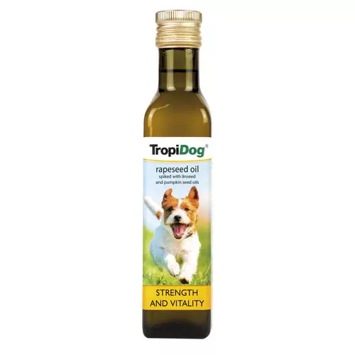 TropiDog Repkový olej pre psov. Doplnkové krmivo pre psov. SILA A VITALITA. Repkový olej s dodatkom ľanového a tekvicového oleja pre psov. Je určený pre doplnenie diéty psov. Tradičný proces lisovania za studena umožňuje vo výrobku zachovať nenasýtené mastné kyseliny, ktoré majú vplyv na: posilnenie obranných mechanizmov organizmu, zmiernenie kožných problémov, zlepšenie kondície srsti. Olej sa používa za studena ako dokonalé doplnenie alebo obohatenie diéty. Dávkovanie (1 krát denne): 1/4 kávovej lyžičky na 2 kg telesnej hmotnosti. V prvých 3 dňoch diéty zmenšite štandardné dávkovanie oleja TropiDog o polovicu. Zloženie: repkový olej 75%, ľanový olej 20%, tekvicový olej 5%. Skladujte na chladnom, suchom a tmavom mieste. Po otvorení fľaše skladujte v chladničke. Usadenina na dne fľaše je prirodzeným javom. Dátum spotreby: vyznačené na obale.