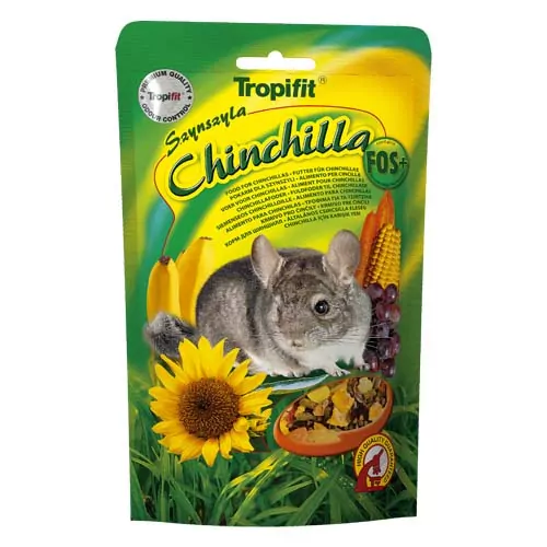 Plnohodnotné krmivo pre činčily s dodatkom mrkvy a červenej repy. Základnou zložkou krmiva CHINCHILLA sú granule z obilia a lucerny získané metódou extrúzie, ktorá zlepšuje stráviteľnosť a vstrebávanie výživných zložiek obsiahnutých v obilninách a lucerne. Okrem toho extrúzia ničí baktérie a plesne prítomné v prírodných surovinách. Veľkosť a tvar granúl umožňujú zvieratám obrusovať zuby a udržiavať ústnu hygienu. Použitie mnohozložkových granúl v krmive CHINCHILLA vylučuje selektívne prijímanie krmiva a v nich obsiahnuté fruktooligosacharidy priaznivo vplývajú na trávenie a črevnú mikroflóru. Množstvo výživných zložiek obsiahnutých v krmive CHINCHILLA ako aj z prírodných zdrojov pochádzajúcich vitamínov, mikro- a makroelementov zabezpečujú činčilám dokonalú kondíciu a peknú srsť. KŔMENIE: zvieratám treba zabezpečiť neobmedzený prístup ku krmivu a vode. Krmivo a vodu každodenne vymieňať.